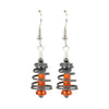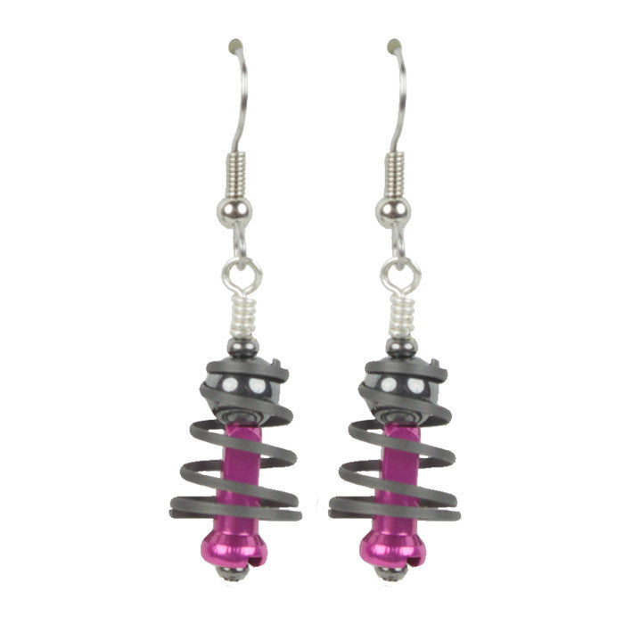 Women on wheels still wear skirts! Sport your skirt on your ears with these springy earrings, handmade from wheel skewer springs and colored spoke nipples, finished off with Surgical Steel ear wires.